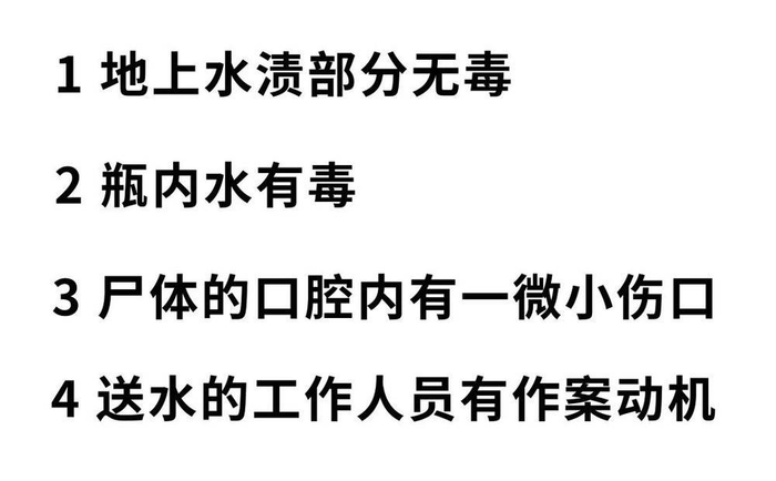 现在各位如果只有有限的时间,只能调查水渍、水瓶、尸体、送水者中的一个线索,你会选哪个线索进行调查呢?