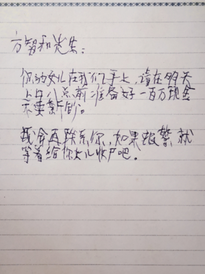 纸条上是一个绑架的威胁信,女人看到纸条非常紧张,就打给警察求助。但警察说光凭一张纸条也不能确定真有一个案件发生,有可能是房客的恶作剧。通常来说,绑架案多是警方在接到受害人的家属报案后出警。警察说你先把门锁好,再检查一下房间里有没有其他线索。