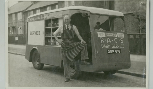 父亲埃塞尔和他的送奶车。画面来自纪录片《雷蒙德·布里格斯》。