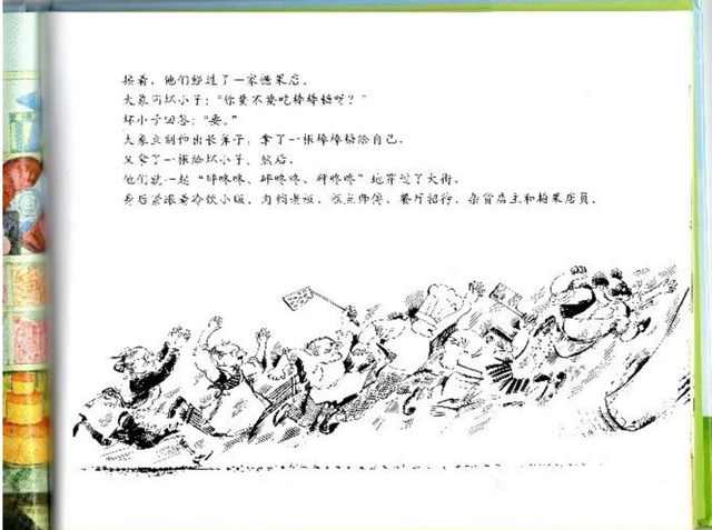 文字作者艾尔弗丽达·维旁特(Elfrida Vipont)以重复的句式和押韵的语言,讲述了一个简单有趣的故事:一个吃货男孩,骑着一头寡言的大象,一路“砰咚咚、砰咚咚、砰咚咚”地穿过大街、白吃白喝,引得一众店铺老板和小摊主纷纷追赶。布里格斯以简笔勾勒的冷饮小贩、肉铺老板、糕点师傅、餐厅招待、杂货店主、糖果店员、水果摊主们,气急败坏,怒目圆睁,惟妙惟肖。这是他第一次有机会,在一本绘本中,如此高密度地、图像化现实生活中的不同职业身份的普通人们。这次引起强烈市场反响的创作,并非偶然的厚积薄发。