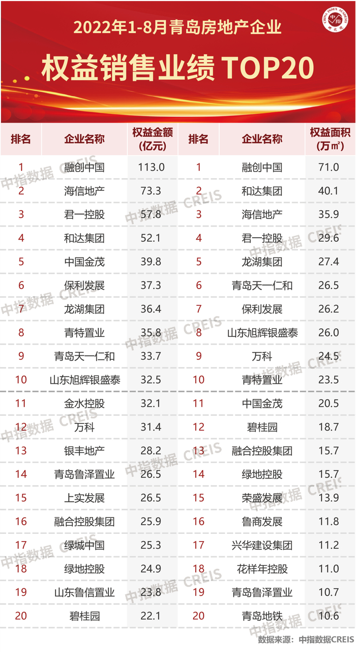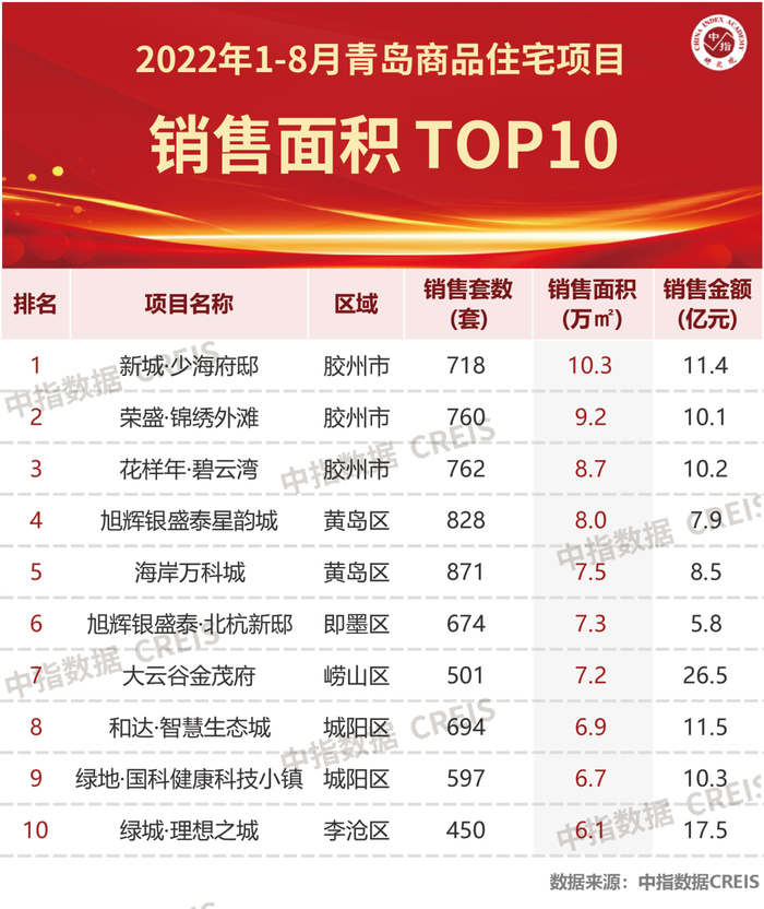 特别声明:房地产企业销售数据统计是以2022年1月-8月期间销售的商品房为统计口径,主要依据中指数据CREIS(点击查看)在青岛的销售监测数据,并同时参考企业提供的相关数据,对少数没有在监测范围内的项目,由企业提供相关文件,经审核,也纳入统计范围。本报告仅供参考,不对使用报告及其内容所引发的任何直接或间接损失承担责任。