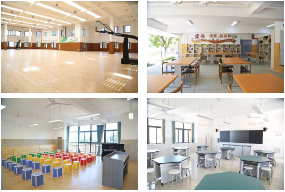 除常规教室外,学校还配备有合唱排练室、美术教室、科学实验室、电脑教室、开发式阅览室、室内运动场、心理咨询室、多功能报告厅等。