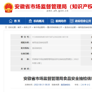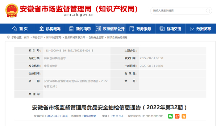 中国质量新闻网讯 8月31日,安徽省市场监督管理局网站发布食品安全抽检信息通告(2022年第32期)。