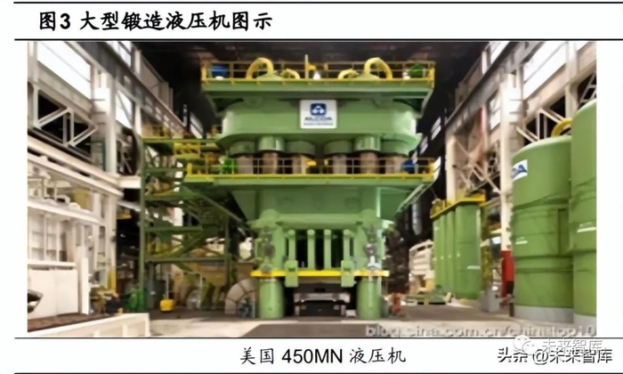 国内的机械锻造业发展相对滞后。直至 20 世纪 50 年代,仍在使用洋务运动时期 引入的英、日、德等国的蒸汽锤、电动空气锤、蒸汽增压式水压机。50 年代末与 60 年 代初,中国逐步开始锻造设备国产化进程,初步可以自制万吨级的水压机和各种类型的 锻锤。受 80 年代改革开放浪潮的助推,锻造工业此后在我国从质到量有了全面发展。根据派克新材招股说明书,目前我国已经成为第一锻件生产大国。为迎应现代航空工业金属部件的加工要求,大压力模锻液压技术应运而生。于 1934 年,德国研制了 70MN 模锻液压机制造战斗机需要的航空铝合金锻件,并于二战期间又 先后制造了 300MN 模锻水压机 1 台、150MN 模锻水压机 3 台。由于模锻液压机对于 空军装备的质量及生产能力十分重要,二战后美苏在获得德国模锻液压机实物的基础上 陆续发展研制出一大批性能优异的大吨位模锻液压机。