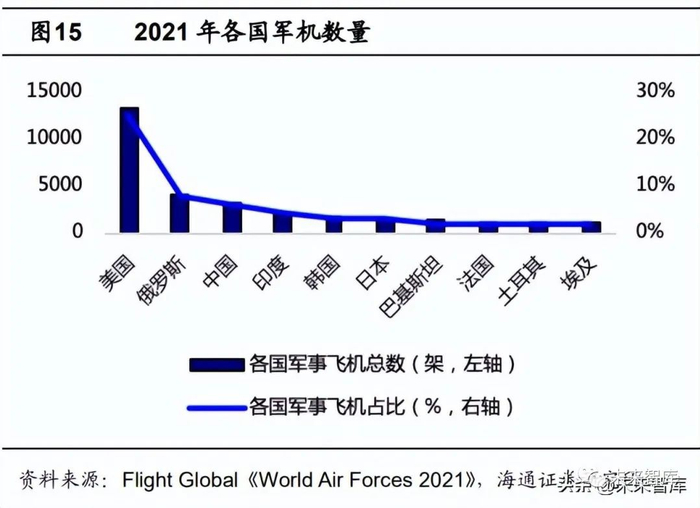 发展战略空军推动军机换装列装提速,将带动军用航空发动机市场增长。我国空军 已进入发展“战略空军”阶段,但目前仍与美国等军事大国存在较大差距。同时,随着 我国航母事业的快速发展,我国未来将形成一定规模的海军舰载机队。截至 2020 年, 我国各种现役飞机型号有十几种,同时据 Flight Global 发布的《World Air Forces 2021》, 我国海陆空各军种军机数量共计 3260 架,约占世界军机数量比重 6%,但对比美国仍 差距巨大。同时,中国战斗机中大量存在着歼-7、歼-8 等老旧二代机型,未来存在较高 的升级换代需求。