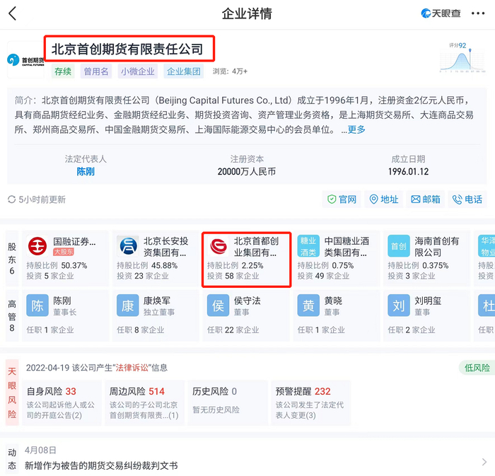 据天眼查工商信息显示,自然人侯守法虽通过由其实际掌控的国融证券和长安投资控制着首创期货96%的股份,但首创集团也直接持有首创期货2.25%的股份,为除侯守法外,最大的持股者。
