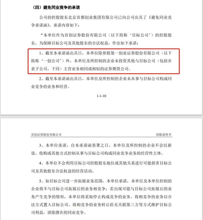 在首创证券最新披露的IPO招股书中称,公司的控股股东首创集团已向公司出具了《避免同业竞争承诺函》,在承诺函的第一条便明确称“截至本承诺函出具日,本单位除参股第一创业证券股份有限公司外,本单位及所控制的企业未投资其他与目标公司(包括并表子公司,下同)主营业务相同或相似的证券期货公司”。