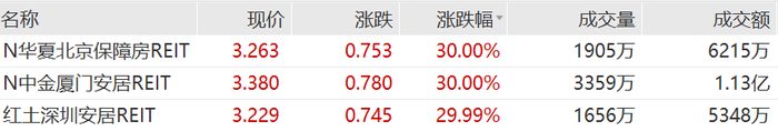 截至当日收盘,华夏北京保障房REIT、中金厦门安居REIT和红土深圳安居REIT分别报3.263元、3.38元、3.229元,成交量分别为19.05万手、33.59万手、16.56万手,成交金额分别为6215万元、1.13亿元、5348万元。