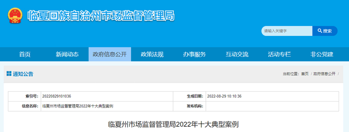 中国质量新闻网讯 2022年8月29日,甘肃省临夏回族自治州市场监督管理局网站发布2022年十大典型案例。