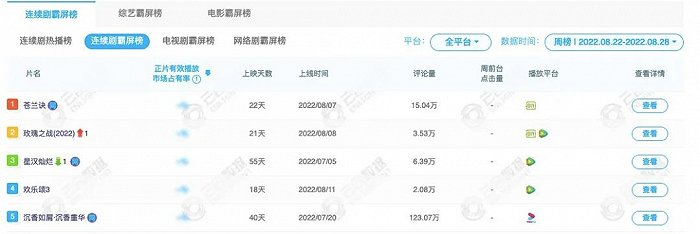 除了《星汉灿烂》《苍兰诀》在各自独播平台不断突破的热度值以外,根据云合数据显示,《星汉灿烂》和《梦华录》分别拿下7月连续剧霸屏榜的第一、三位,而8月22日—8月28日的连续剧霸屏榜周榜的一、三位则分别为《苍兰诀》和《星汉灿烂》。