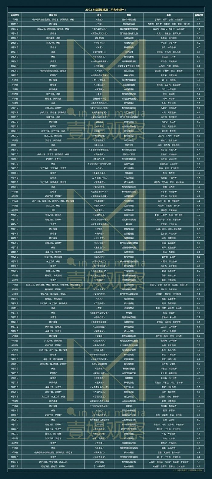 从2022年上线并获得豆瓣评分的剧集来看,《大山的女儿》获得9.3的超高分,《警察荣誉》《异物志》《超越》《人世间》《风起陇西》获得8分以上的高分,《梦华录》则以8.0分跟随其后,要知道它曾一度达到8.8分,也曾引起过“报复性打五星”的现象;《苍兰诀》与开年爆款《开端》同为7.8分,《星汉灿烂》以7.6分与《庭外》《胆小鬼》稍低于7.7分的《亲爱的小孩》和《破事精英》。2022年豆瓣评分靠前的剧集中,古偶、仙侠的身影不少,同时,《梦华录》的评价人数超过75万,《星汉灿烂》超过41万,《苍兰诀》也有40万+。