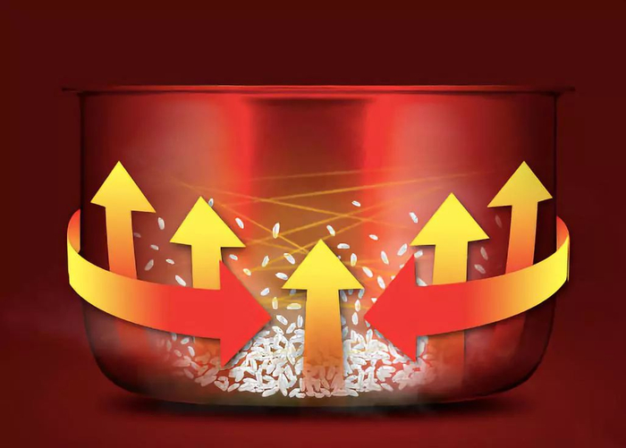 煮饭时,底部的平板加热器为内胆充分加热,使锅内形成强力热循环气流,会令内胆中的米充分、均匀地受热。