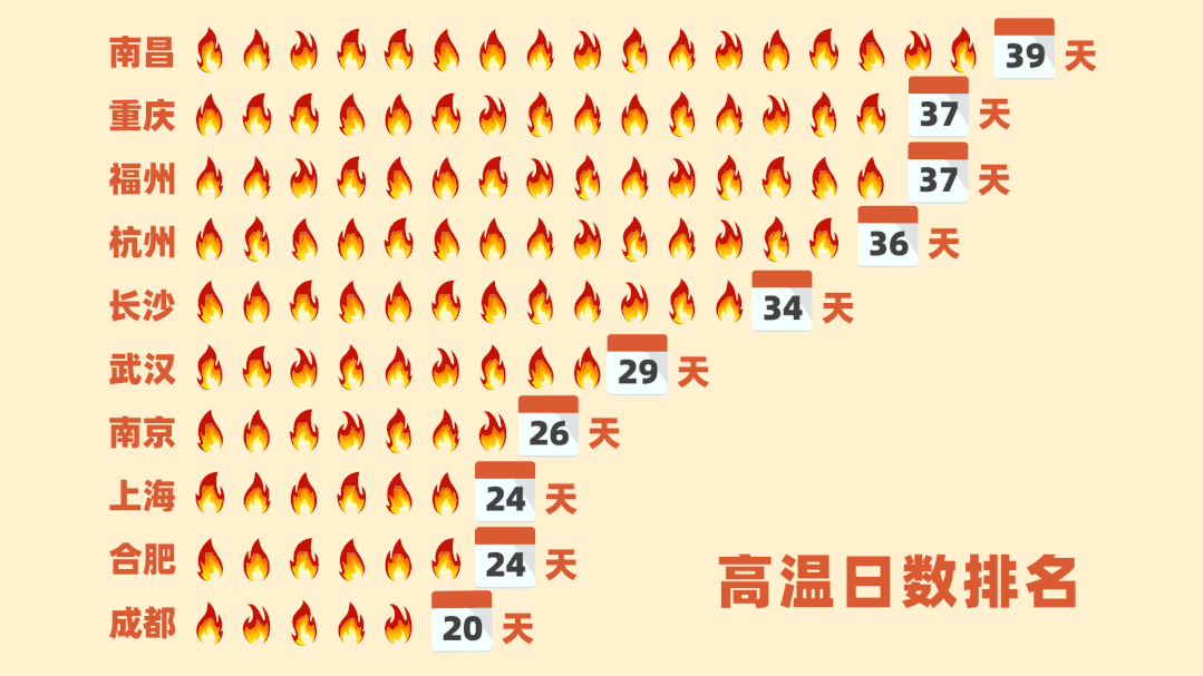 本轮天气过程中,全国高温日数累计TOP10的省会(直辖市、自治区首府)城市 分别为:南昌39天、重庆37天、福州37天、杭州36天、长沙34天、武汉29天、南京26天、上海24天、合肥24天、成都20天。