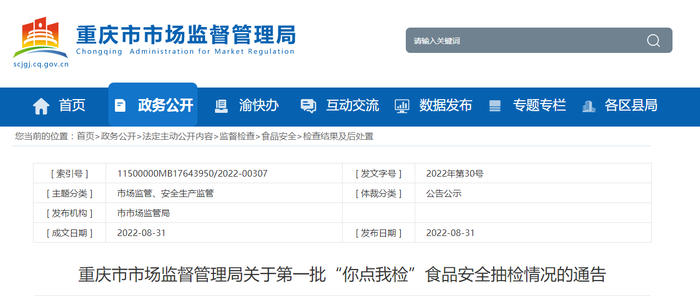 中国质量新闻网讯 近日,重庆市市场监督管理局关于第一批“你点我检”食品安全抽检情况的通告公布。