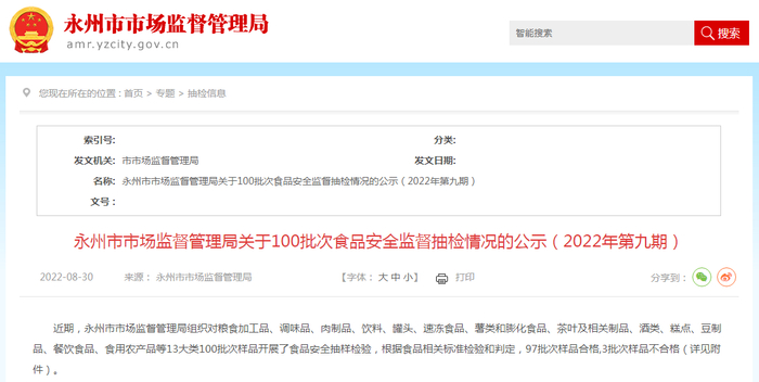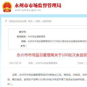 中国质量新闻网讯 近日,湖南省永州市市场监督管理局发布关于100批次食品安全监督抽检情况的公示(2022年第九期)。