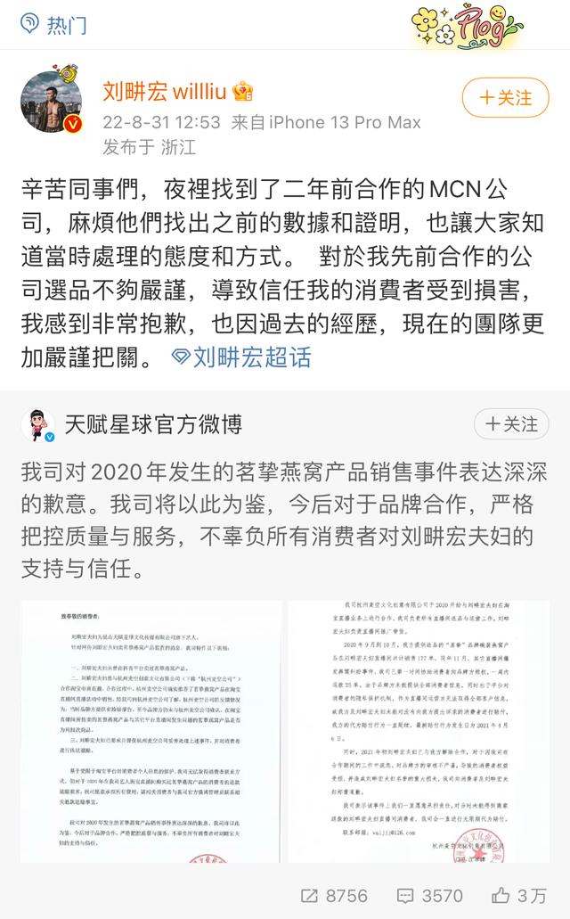 刘畊宏个人微博账号8月31日发布消息,称找到了两年前的数据和证明,“对于我先前合作的公司选品不够严谨,导致信任我的消费者受到损害,我感到非常抱歉”。