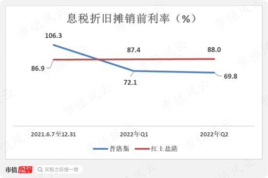 此外,中金普洛斯的息税折旧摊销前净利率在2022年上半年下跌至70%附近,低于红土盐港的约87%,创造分红的能力相对较弱。