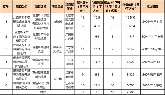 中金普洛斯REIT(508056.SH、下称“中金普洛斯”)是由6个项目公司所持有的7个仓储物流园组成,分布于北京市、广东省和江苏省三处经济发达的省/市,建筑面积合计约70.5万平方米,可租赁面积合计约70.8万平方米。
