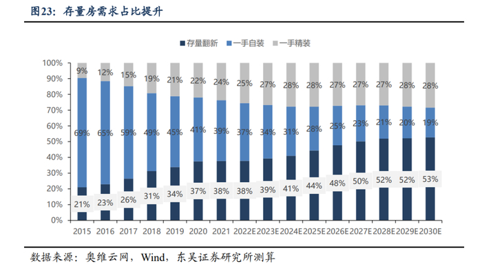 存量房贡献稳定需求支撑。按照15年的重装周期计算,随着2005-2015年竣工的住宅逐渐进入翻新周期,存量房装修市场规模将迎来高增,我们预计2020-2025年存量房翻新装修需求市场规模CAGR约11%,2030年我国存量房占比或提升至50%以上。2019年以来,我国不断深化对老旧小区的改造工作,根据历年政府工作报告,2019-2021年实际新开工改造的老旧小区分别为1.8万、4.03万、5.56万个,2019-2021年累计惠及居民数量超过2000万户。按照2-3年建设周期估算,2022年起旧改房屋释放的家居需求将开始逐步增加。此外,二手房交易的增加也将提升C端装修需求,翻新需求较大,存量房装修改造市场空间广阔,将为下游装饰原纸行业贡献稳定需求支撑。