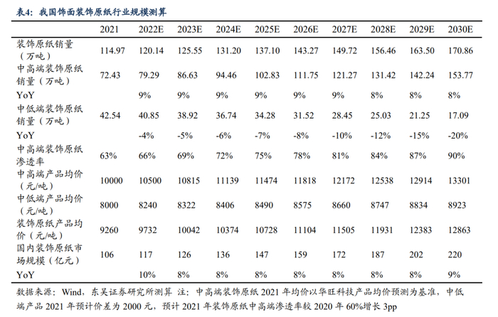 我国中高端装饰原纸市场持续扩容,2025年预计装饰原纸市场规模达147亿元,中高端产品达118亿元。根据中国林产工业协会统计,我国2021年饰面装饰原纸总销量为115万吨,我们假设2021年中高端装饰原纸渗透率为63%(预计2021年装饰原纸中高端渗透率较2020年60%增长3pp)。销量假设方面,我们参照Kepler数据,预计我国装饰原纸行业2020-2030年销量CAGR为4.5%;渗透率假设方面,对标欧洲装饰原纸行业中高端渗透率100%,假设2022-2030年渗透率逐年+3pp,我们预计至2030年中高端装饰原纸渗透率达90%。单价假设方面,我们假设2021年中高端装饰原纸单价与华旺科技装饰原纸销售单价保持一致,中低端产品单吨价格较中高端产品低2000元。由于我们预计2022年原材料价格高企,中高端/中低端产品市场均价分别同比+5%/+3%,此后逐年+3%/+1%,2030年国内装饰原纸总规模预计达220亿元,2021-2030年国内装饰原纸市场规模CAGR为8.4%。