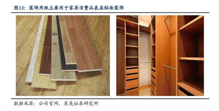 装饰原纸主要应用于家居消费品表层贴面装饰,理化性能及环保性能突出。装饰原纸属于工业特种纸之一,是一种新型人造板贴面材料,最早于欧美国家兴起。从分类上看,装饰原纸可分为表层原纸、面层原纸和平衡原纸三类。面层装饰原纸具有良好的装饰效果,是装饰原纸最主要的种类,2021年我国饰面装饰原纸销量占装饰原纸总销量95%。面层装饰原纸可分为高克重的三聚氰胺浸渍装饰原纸及低克重的宝丽板纸,浸渍装饰原纸经过工艺提升后渗透性、遮盖力等理化性能与环保性均超越宝丽板纸。基于上述性能优势,三聚氰胺浸渍纸逐渐成为人造板主流的贴面材料之一,终端消费领域通常为家具、木门和地板等家居消费品。