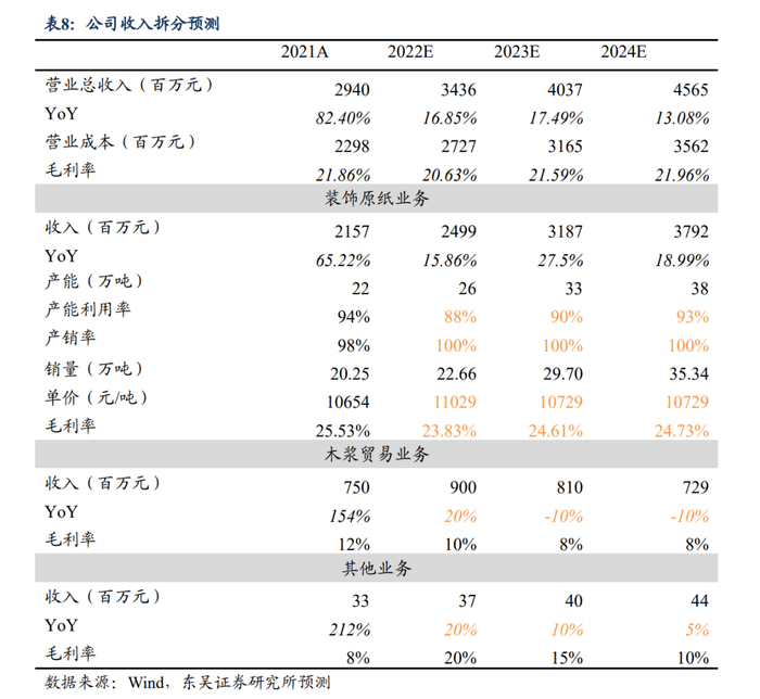 公司产能逐步释放,业绩持续高增。国内市场随着存量改造、精装占比提高及应用领域开拓,中高端装饰原纸渗透率有望进一步提升。公司在技术、渠道、成本管控层面竞争优势稳固,中高端产品具有强竞争力。公司未来产能逐步释放,成长路径明晰突破瓶颈,匹配旺盛市场需求,我们预计2022-2024年公司装饰原纸销量分别为23/30/35万吨。公司产业链顺价能力较强,有效抵御原材料价格波动并维持吨盈利稳定,考虑到2022年原材料木浆及钛白粉价格高企,公司盈利能力有所承压,我们预计公司2022-2024年装饰原纸毛利率分别为23.83%/24.61%/24.73%;木浆贸易2022-2024年营收为9/8.1/7.29亿元,毛利率分别为10%/8%/8%;其他业务2022-2024年营收为0.37/0.4/0.44亿元,毛利率分别为20%/15%/10%,对总收入和利润影响非常有限。公司储备10万吨特种纸产能,中长期计划布局1-2个新纸种,因此后续可能贡献公司业绩新增长点。