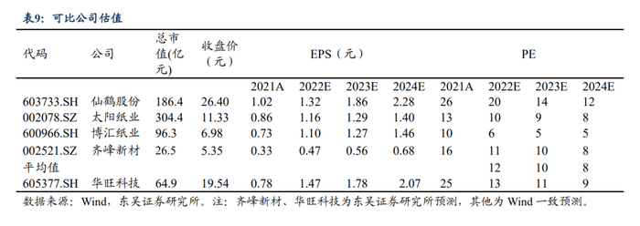 公司作为高端装饰原纸行业龙头之一,主要业务为装饰原纸和木浆贸易,因此我们选择同属于装饰原纸行业的仙鹤股份、齐峰新材及同属于木浆行业的太阳纸业、博汇纸业公司作为可比公司。我们预计2022-2024年公司归母净利润分别为4.9/6.1/7亿元,对应PE 13/11/9X,当前估值性价比优势明显,首次覆盖,给予“增持”评级。