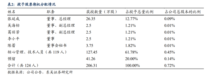 2021年6月,公司发布股权激励计划,涵盖公司董事、高管、核心技术人员等124人,绑定公司与核心团队利益。股权激励计划中核心管理、技术人员授予总量占比60%以上,充分激发公司生产积极性,保障公司长期稳定发展。