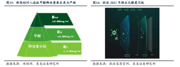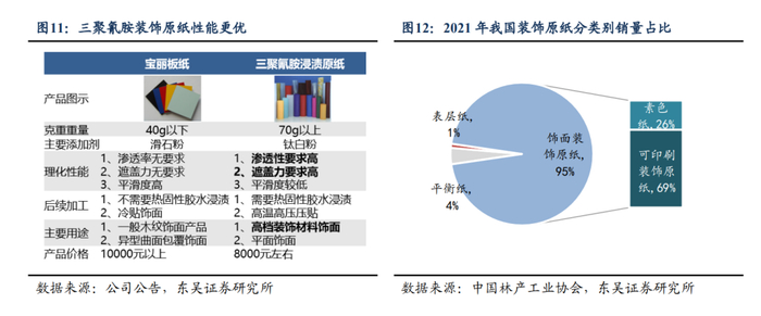 三聚氰胺装饰原纸环保性能突出,政策鼓励行业发展。相比其他纸类,装饰原纸采用低挥发性的水性油墨进行印刷,相较传统的油性油墨环保性更高。我国“十四五”中明确提出大力推广使用低挥发性有机物含量的油墨,2021/2/1国家级标准《低挥发性有机化合物含量涂料产品技术要求》实施,国家环保政策不断完善,政策推动下装饰原纸行业不断向环保化的方向发展。同时,2021年人造板新国标进一步细化人造板及其制品甲醛释放量,分级E1级、E0级和ENF级,其中E0级和ENF级要求严格程度超过美国CARB-NAF标准,人造板中较为劣质材料逐渐退出市场,头部定制家居企业推出以高端装饰原纸作饰面的无醛环保人造板。