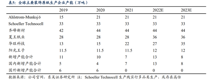 开拓海外装饰原纸市场,产品出海空间广阔。站在全球的视角看,欧洲为全球装饰原纸发源地,中高端装饰原纸产能曾集中于欧洲。但由于欧洲装饰原纸企业由于生产设备及产品线较为陈旧,且人工成本高企、排产周期长、环保成本较高,叠加欧洲装饰原纸市场需求增速趋缓,老牌装饰原纸生产企业技术及产品更新换代动力不足。相较于欧洲企业,现阶段我国装饰原纸产品稳定性和质量更胜一筹,装饰原纸销量占全球需求量比重不断上升。从国内外企业新增产能角度看,国外企业均为通过并购中国装饰原纸生产企业实现扩产,而国内企业不断新建产能扩大全球市占率。在欧洲等中高端装饰原纸市场进一步打开的背景下,高端装饰原纸产业中心逐渐转移至中国,利好我国产品质量优越、出货稳定的中高端装饰原纸企业产品出海。