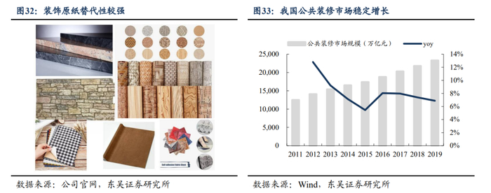 3)装饰原纸下游应用场景多元化。从终端应用领域看,装饰原纸主要应用于家居市场和室外装修领域。据中国林科院木材工业研究所统计2017年装饰原纸在家居领域/其他领域消耗量约为77%/23%,我们调研结果显示2021年家居市场消费场景占比降低至60%,室外装修领域占比上升至40%。装饰原纸因其性价比高、抗撞耐磨、防火阻燃的特点,能够替代大理石纹、布纹、仿石材、皮纹以及多种木纹,在室外装修、医院、机场等公共装修运用领域逐渐丰富。我国公装市场2011-2019年以CAGR 8%的增速稳定增长,带动装饰原纸行业下游需求量增加。
