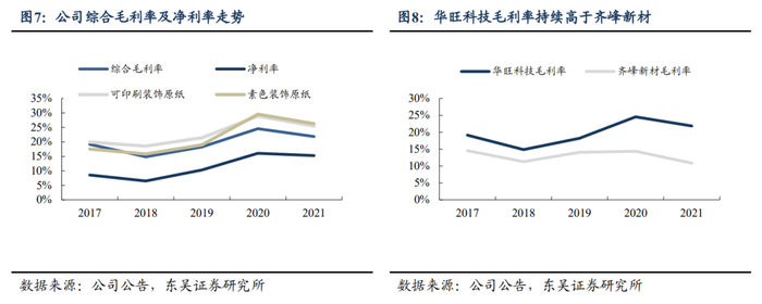 公司主要装饰原纸产品分为可印刷装饰原纸和素色装饰原纸两类。分业务看,公司装饰原纸生产业务和木浆贸易业务2021年占主营收入分别为73%和26%,其中可印刷装饰原纸/素色装饰原纸占主营业务收入比重分别为67%/7%。毛利率方面,由于公司核心装饰原纸业务定位中高端,盈利能力较为突出。2021年公司综合毛利率为22.02%,同比-0.73%,公司主要产品可印刷装饰原纸/素色装饰原纸毛利率分别-1.34%/-1.59%,持续高于齐峰新材等竞争对手。