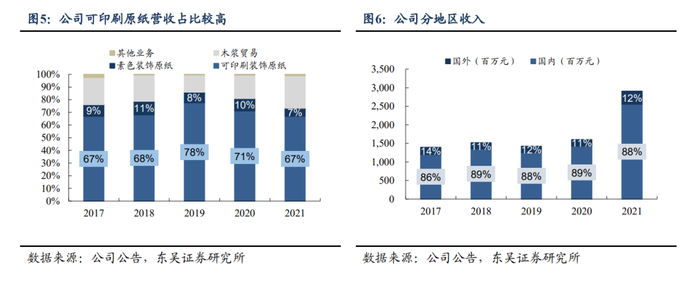 分区域看,2021年公司内销/外销收入分别为25.59/3.48亿元,占比88%/12%。海外销售主要来自于装饰原纸业务,海外客户集中在印度、韩国。公司在设备和技术储备方面优势明显,产品在世界范围内具有较强竞争力。随着公司装饰原纸产能后续逐步投放,将会进一步打开欧洲等海外高端装饰原纸市场。
