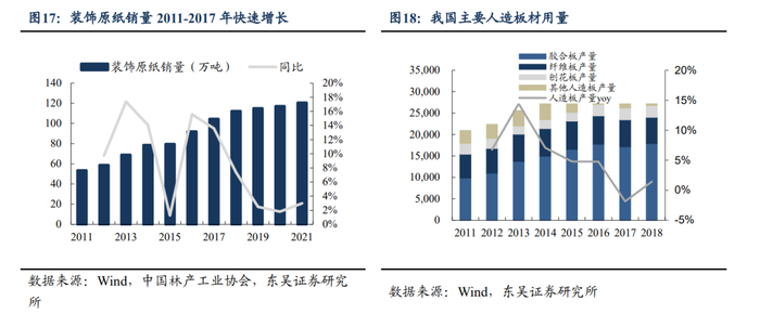 2008年-2017年地产高速发展带动装饰原纸需求增加。随着地产行业蓬勃发展,为家居产业链发展创造广阔市场空间,家具、地板与木门制造业开始崛起,为人造板基材及其贴面材料提供稳定需求,从而打开了装饰原纸的市场空间,以2011年-2017年我国装饰原纸销量CAGR为12%,带动我国装饰原纸销量行业快速发展。