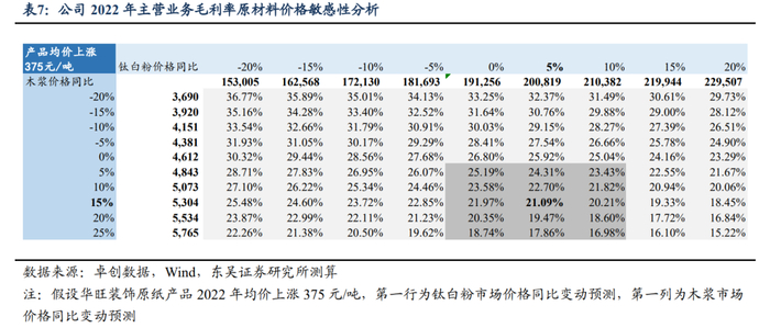 向下传导成本波动,实现风险部分转嫁。公司于木浆价格上涨阶段顺利完成产品价格上调,转嫁部分成本压力;浆价下行期间,产品价格保持较强韧性,凸显公司强盈利能力。从华旺分季度吨盈利来看,原材料价格下跌业绩弹性明显增强;公司产业链顺价能力较强,原材料价格上涨吨盈利维稳。从华旺科技涨价落地情况来看,中高端装饰原纸价格易涨难跌。由于产品高度非标定制客户粘性高、在成品中价值占比较仅为1.7%、下游需求周期属性弱,华旺科技产业链议价能力较强。2021年木浆及钛白粉价格高企,公司分别于2020Q4、2021M3及2021M4对装饰原纸产品提价1000/1000/1500元,提价落地情况较好,2021Q3浆价出现回落,公司并未主动降价,体现公司较强的盈利能力。