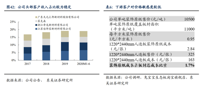 产品非标定制化占比较高,满足客户个性化需求,下游客户渠道黏性强。头部家居公司对装饰原纸产品质量及稳定性要求高,对产品技术指标敏感度较高但价格敏感度较低,根据我们测算,高端装饰原纸价值占下游人造板成本仅1.7%,下游客户对装饰原纸价格不敏感,在双寡头竞争格局下公司产业链议价能力较强。同时公司70%以上订单为定制化生产,公司行业经验丰富,通过建立数据库满足客户定制化生产技术指标,适应下游印刷更个性化、高端化的需求,能够根据市场动向主动推介新产品,凭借产品优势渠道把控力强。