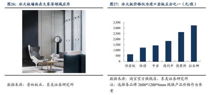 1)相比天然原材料,装饰原纸性价比优势明显。岩板作为一种高级瓷质板材,由天然粘土、二氧化硅等天然原材料经特殊工艺制成,因其外观自带高级感、重量仅为传统大理石1/3,具备施工简单、防火防污等优点,近年风靡大家居领域。但天然原材料制成的岩板的价格偏高,用作墙面装饰的岩板通常价格为1200-3200元/张。冰火板作为仿岩板的产品,为木质基材在防火基材上附着高端浸渍装饰原纸,在满足基本防火环保的基础上,同样面积均价仅为600元,价格仅为进口岩板的五分之一,性价比优势凸显。