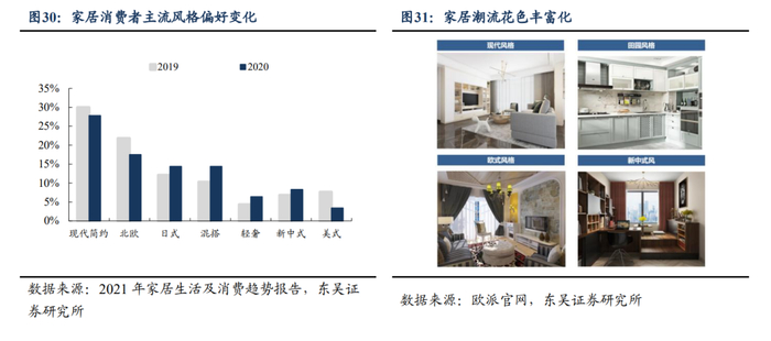 2)以90后为主的新消费群体追求家居个性化、颜值,倒逼终端家居企业开发家居新花色。我国家居生活及消费不断迭代升级,新消费群体对家居颜值越来越重视,同时审美与上一代差别较大,混搭、轻奢等个性化风格崛起。在产品趋同情况下,色彩能够提高产品竞争力和附加值,终端家居企业为满足主流消费者需求,潮流花色逐渐由现代简约风向多种花色演变,对花纹精美、理化性能突出的人造板需求增加,从而进一步拓宽了装饰原纸的市场,对中高端装饰原纸,尤其是可以印刷更多花色的可印刷装饰原纸需求持续增强。