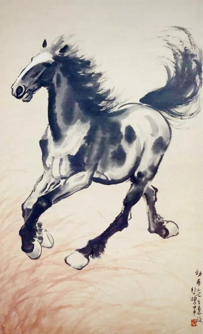 《奔马》创作于 1944 年,这正是抗日战争临近胜利之际,也是国画大师徐悲鸿艺术创作的巅峰之时。大师画马强调骨骼,在其躯干和头部都可看到明显的骨骼结构;马腿、马蹄处的细节亦都刻画得十分清晰到位。为了表现马的肌肉,画家将西方的光影画法应用到作品中,形成中国传统水墨与西方写实技法的完美融合。马的臀部和背部常见有大面积留白,目的是通过明暗对比来表现马的雄健,透视感、体积感十足。