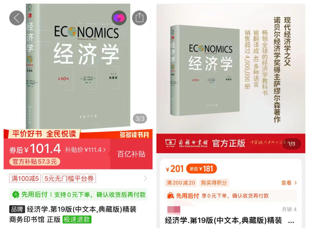 笔者还有个小小的发现,众多大咖推荐的财经届“常青树”书籍、萨缪尔森的名著《经济学第19版》在读书月补贴后只要101元,而在其他平台的最低价也是180元。