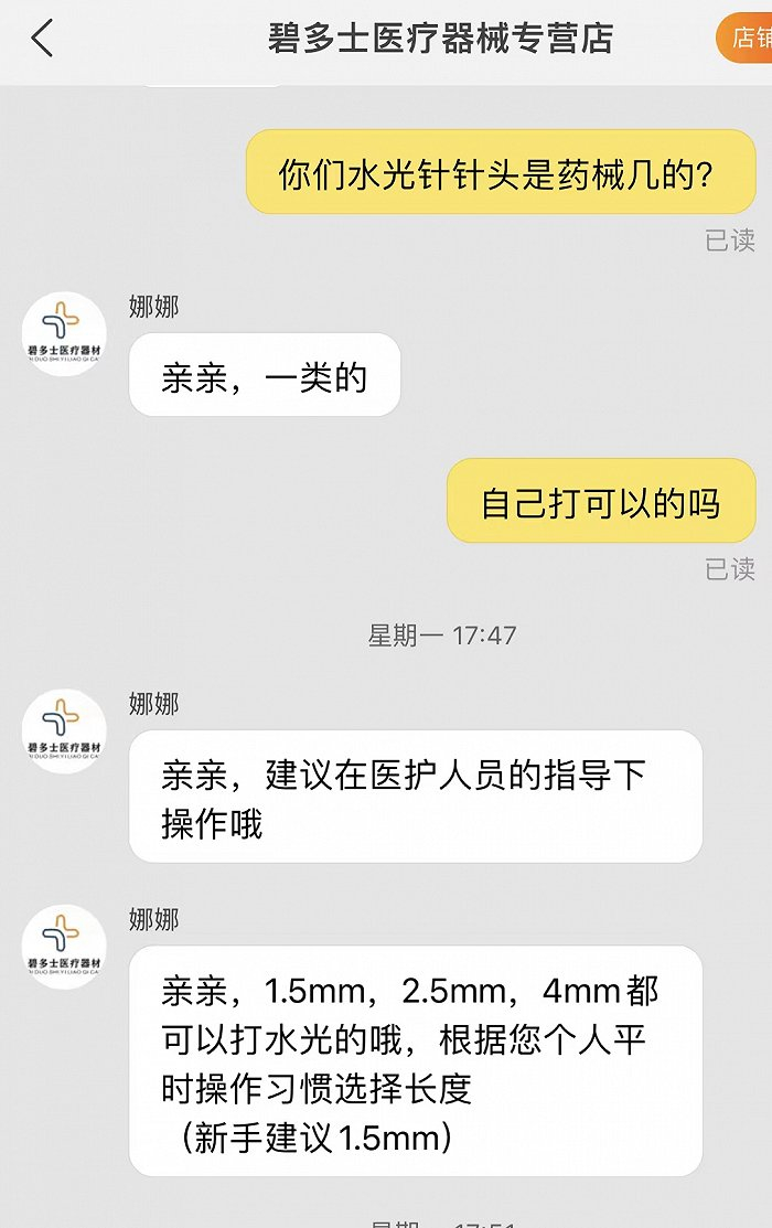 前述厂商人士则表示,消费者产生过敏、刺激反应等现象投诉到医美机构,往往都会与医美机构探讨是否因为水光注射的液体产生不适,反而忽略了采用什么针头打进去。在维权层面,消费者实际上也是不太可能考虑到针头还会存在违规的情况。
