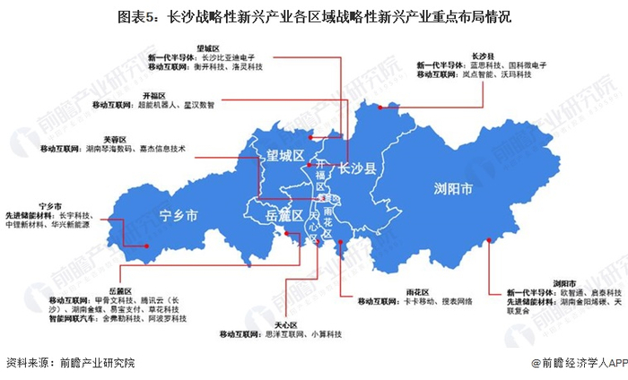 长沙新兴产业主要集中在长沙的中西部地区,例如,望城区、岳麓区、天心区等地。其中,望城区重点发展的战略性新兴产业较多,望城区重点新一代半导体、先进储能材料和移动互联网等战略性新兴产业。而值得注意的是,长沙县虽为核心发展地带,但其主要在推动支柱产业的发展,其在战略性新兴产业上注重新一代半导体和移动互联网领域。