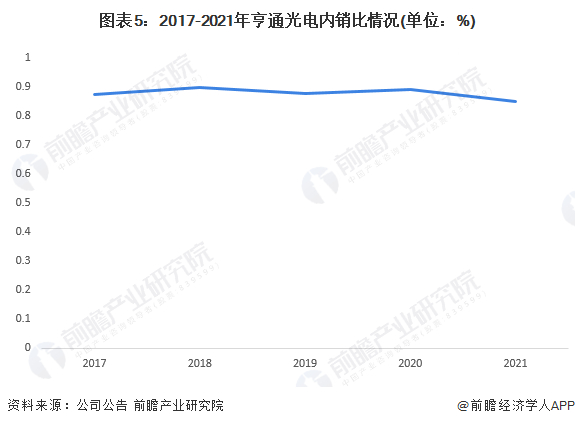 2017-2021年,亨通光电的内销比长期维持在84%以上,市场主要集中在国内地区,2021年,光纤光缆行业发展将受益于国家整体网络建设和数字经济发展。随着5G网络的建设及千兆光纤的升级,国内光纤光缆有望迎来新一轮需求。