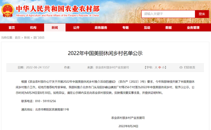 近日,农业农村部网站公示2022年中国美丽休闲乡村名单。公示提到,经地方推荐和专家审核,拟推介北京市门头沟区妙峰山镇炭厂村等256个村落为 2022年中国美丽休闲乡村。其中,益阳高新区谢林港镇清溪村上榜。