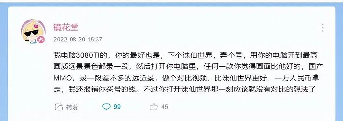 有些视频中的《诛仙世界》,确实是画面“塑料”,建模“僵硬”,整体画面质量十分“手游”。但同样的,也有土豪玩家放言“画质全部开满,国产MMO里有画面比《诛仙世界》好的,做个对比视频,找我拿一万块”。