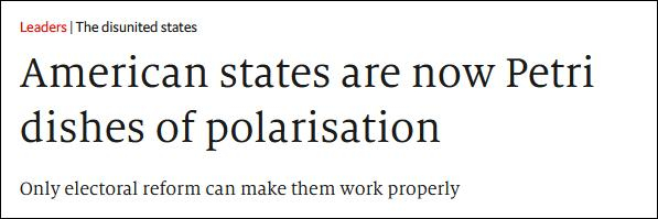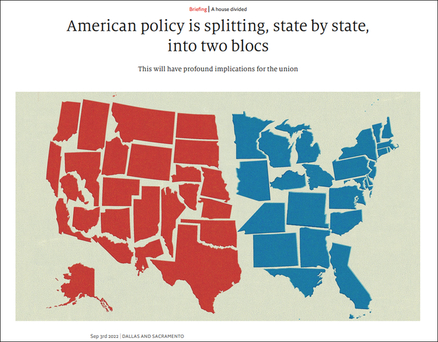 在封面故事(Briefing)中,《经济学人》进一步阐释了美国当下的分裂现状。该文认为,美国的政策正在分裂,一个州接一个州地分裂成了两个集团,这将对联邦体制造成深远影响。各州不同社会和经济政策走向,反映出美国日益严重的意识形态两极分化,所有美国人都将深深感受到其后果,其影响将波及全世界。