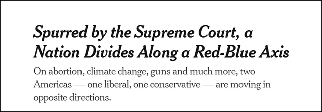 美国《纽约时报》7月2日刊文形容,“在最高法院的刺激下,一个国家正沿红蓝轴线分裂”。美国各州似乎正分裂为不同的国家,推行截然相反的社会、环境和卫生政策,我们把它们称为“分众国”(Disunited States.)。