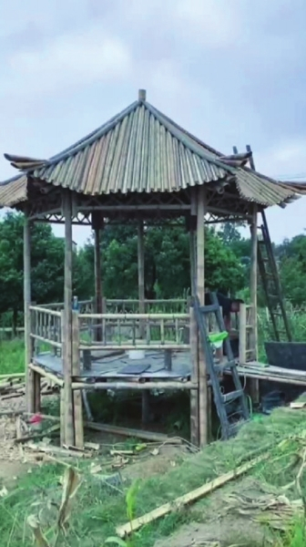去年夏天,戴小竹耗时二十天打造的六角竹亭。