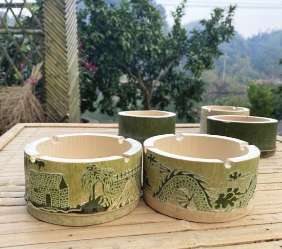 除了制作桌椅家具,戴小竹还研究在竹子上做雕刻,在他的巧手下,一条龙蜿蜒盘旋在一个竹制的烟灰缸上,活灵活现,很多网友在评论区求购。
