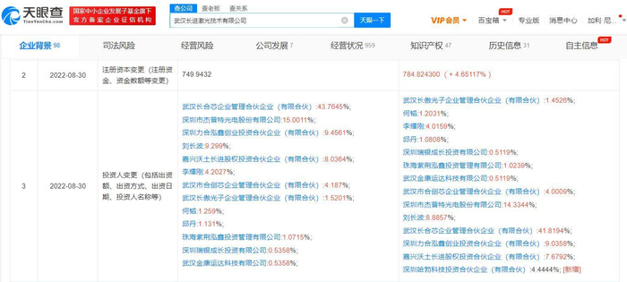 天眼查App显示,近日,武汉长进激光技术有限公司发生工商变更,新增深圳哈勃科技投资合伙企业(有限合伙)为股东,持股约4.44%。同时,公司注册资本由749.94万人民币增至784.82万人民币。